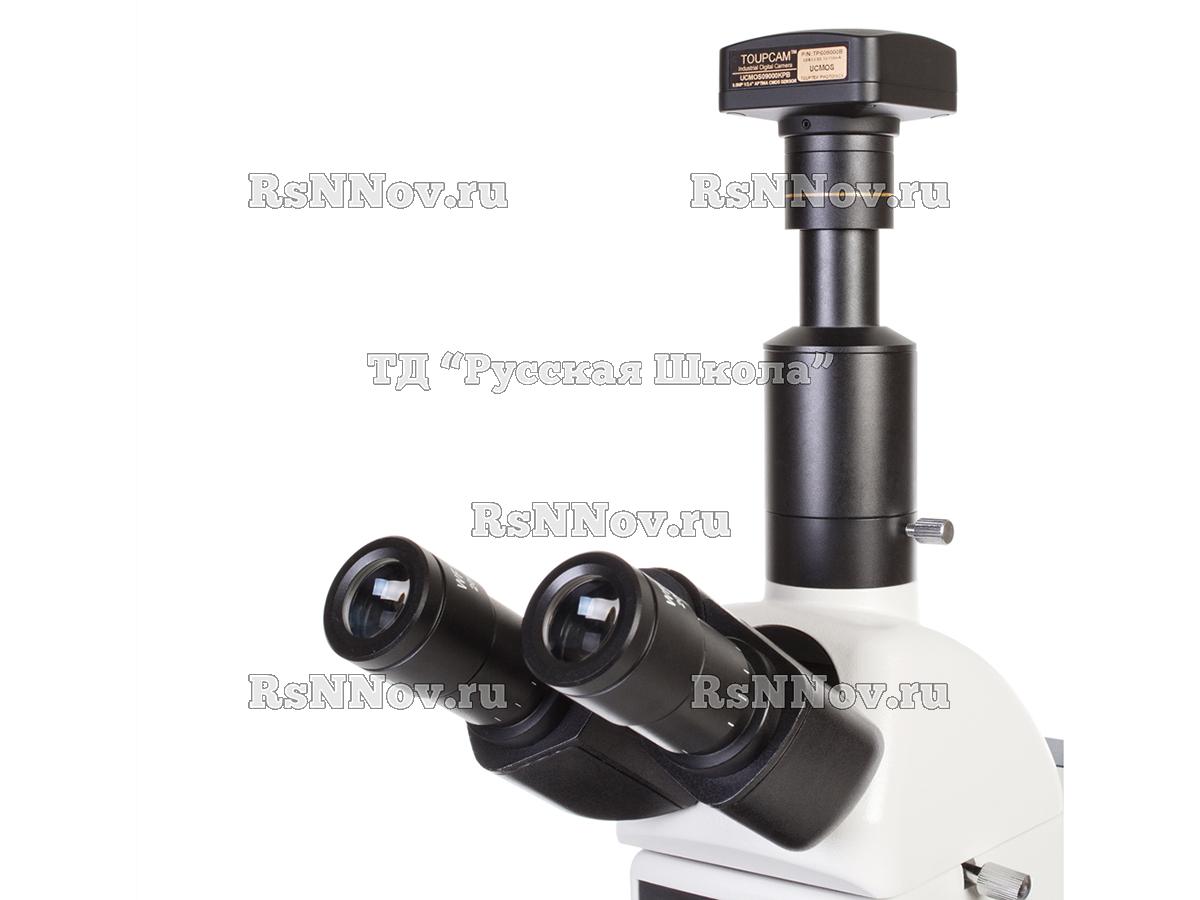 Конструкция тринокулярной визуальной насадки микроскопа позволяет выводить изображение в режиме реального времени на экран ПК с помощью видеоокуляра (в комплект не входит). Видеоокуляр устанавливается в специальный выход - канал визуализации. Это позволяет одновременно наблюдать изображение через окуляры микроскопа и на экране ПК.