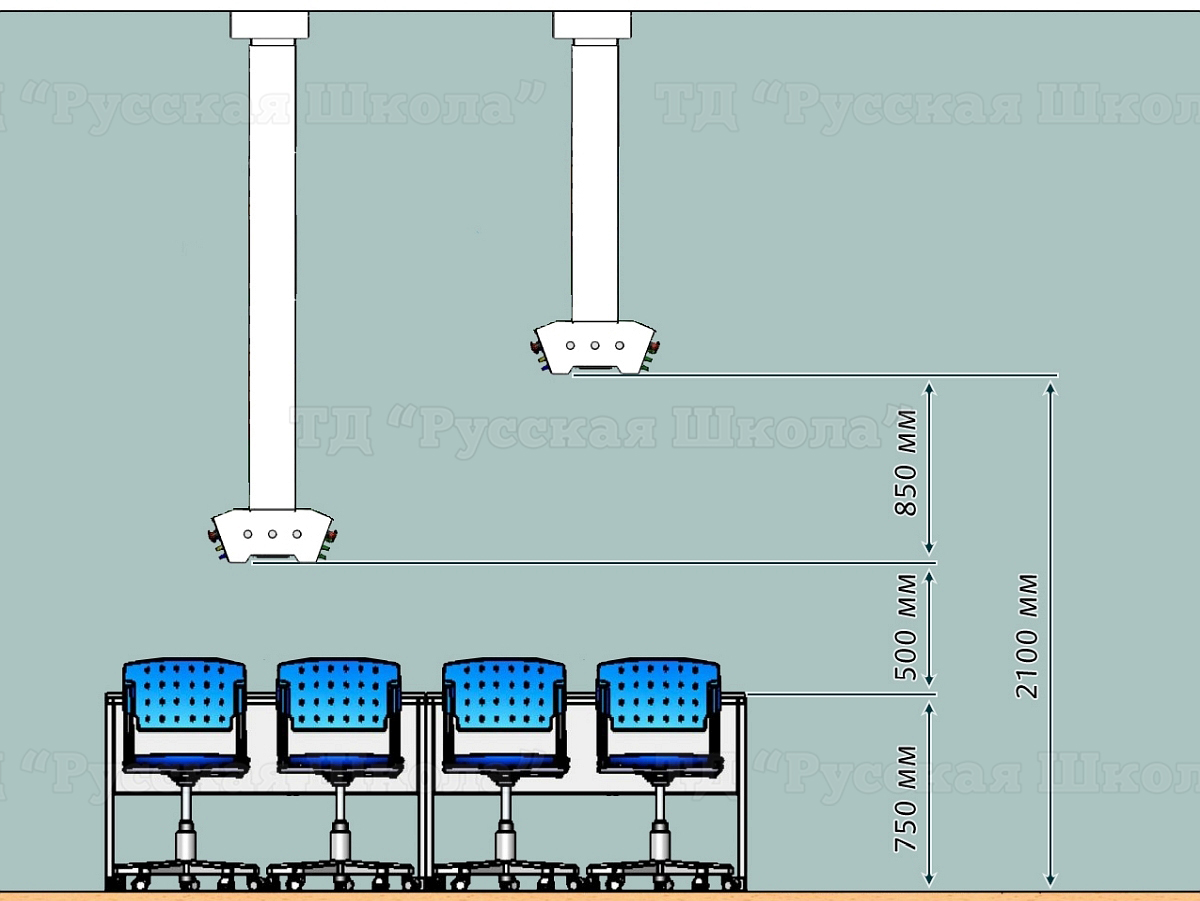 Кабинет может быть оснащен потолочными модулями от 4 (16 учеников) до 8 модулей (32 ученика). Один потолочный модуль рассчитан на 4 ученика.