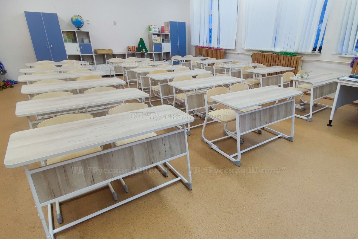 Оформили кабинет в МБОУ «Школа №14» города Саров Нижегородской области. Для ученической мебели и стола учителя выбран белый металлокаркас и ЛДСП с текстурой натурального дерева. А вот для шкафов были выбраны цветные фасады. Кстати, все шкафы и секции установлены на металлокаркас, что позволяет не только выставить мебель ровно (и исключить неровности пола), но и дает доступ к влажной уборке под ними. А чистота - залог здоровья!
